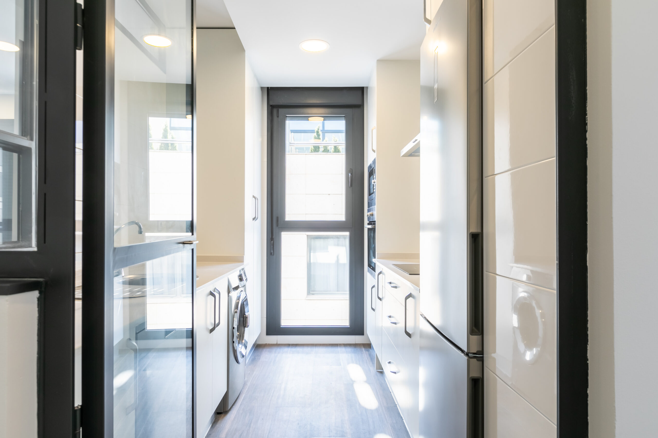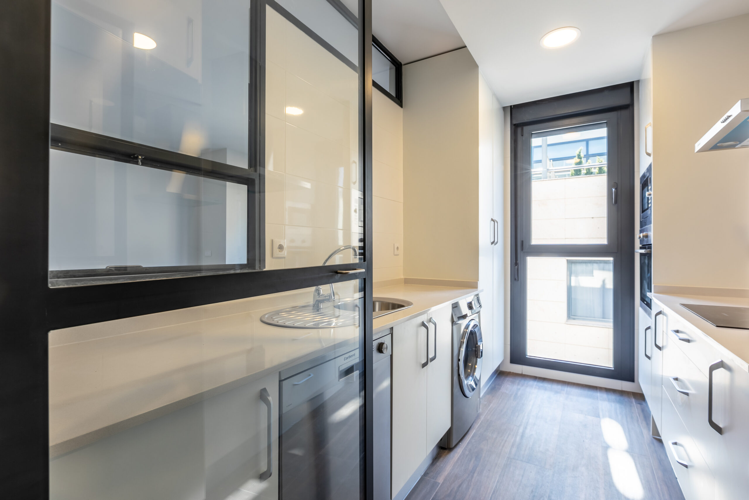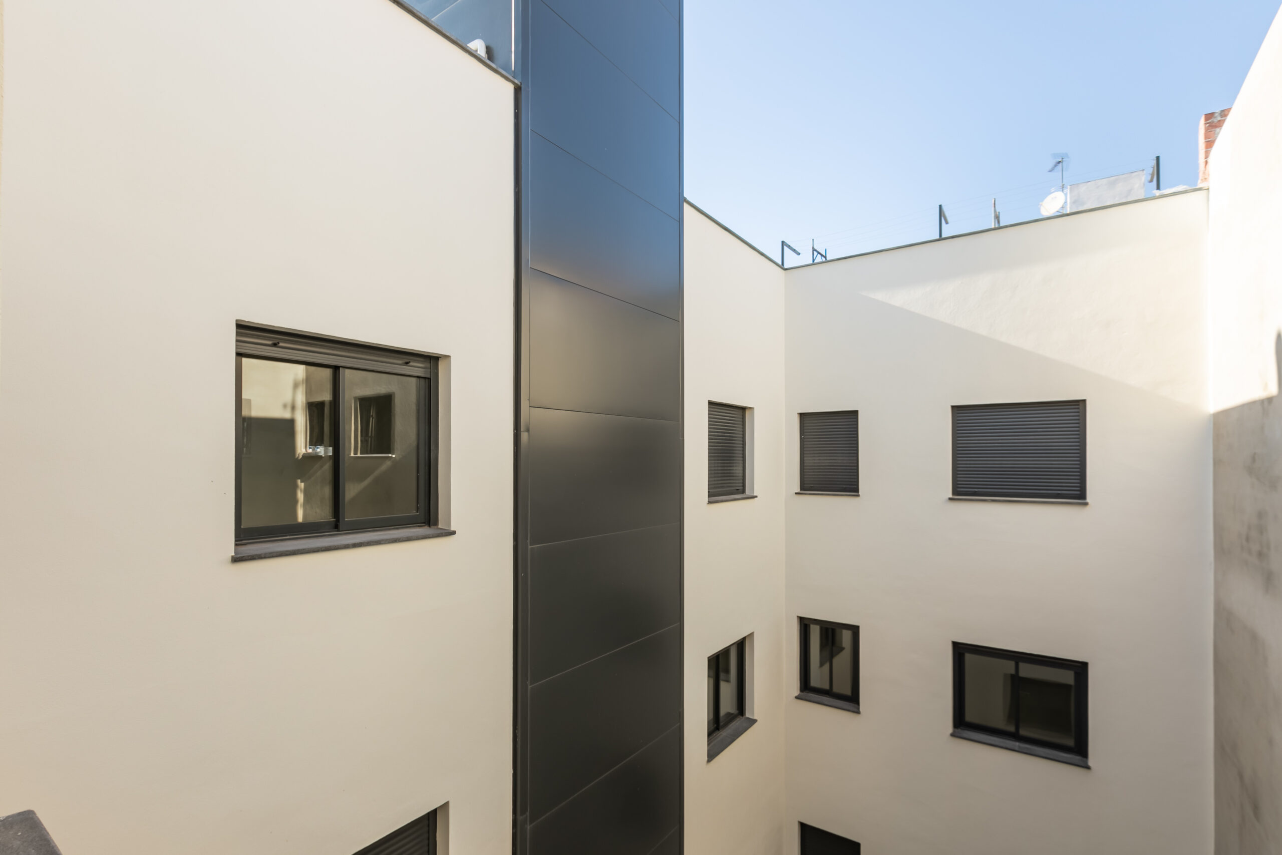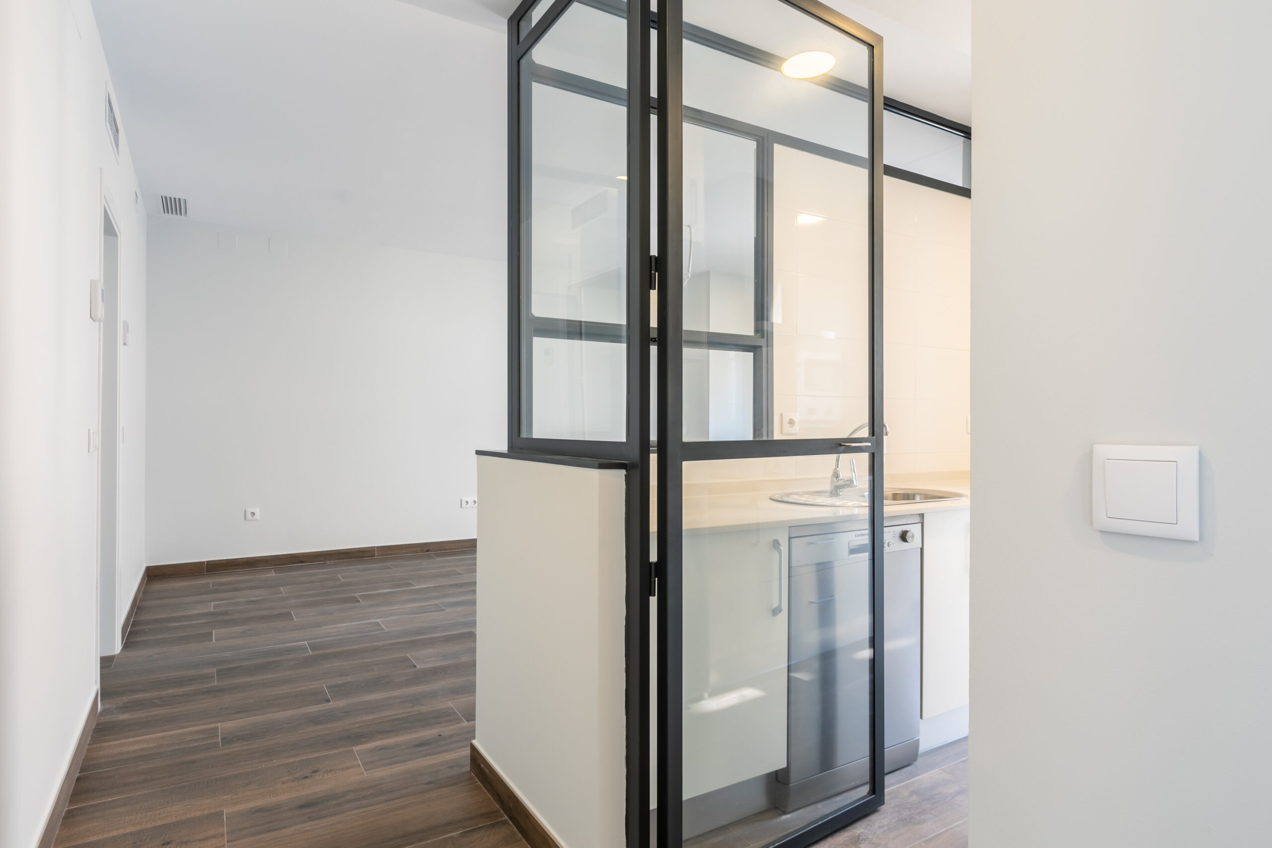 De todas ellas, destacan el salón-cocina, que se conectan visualmente a través de una carpintería de forja a modo de pasa-platos, que posibilita una iluminación natural abundante durante todo el día y a su vez agradable al presentar su fachada a una calle estrecha cuyos edificios arrojan la sombra necesaria para proteger los amplios ventanales de un soleamiento agresivo.«