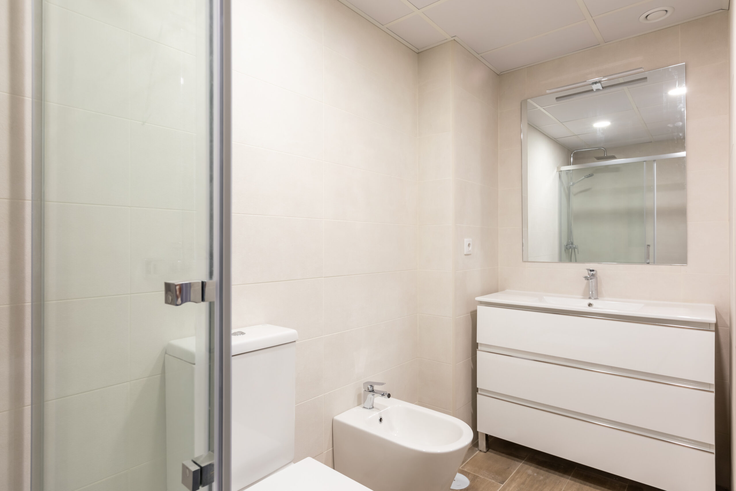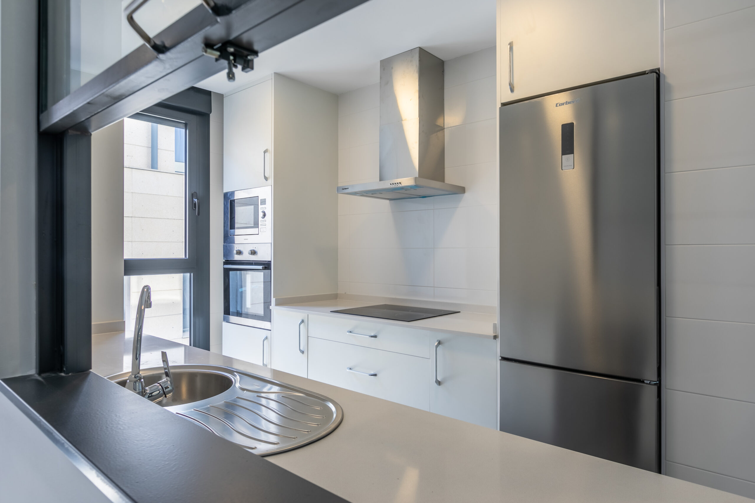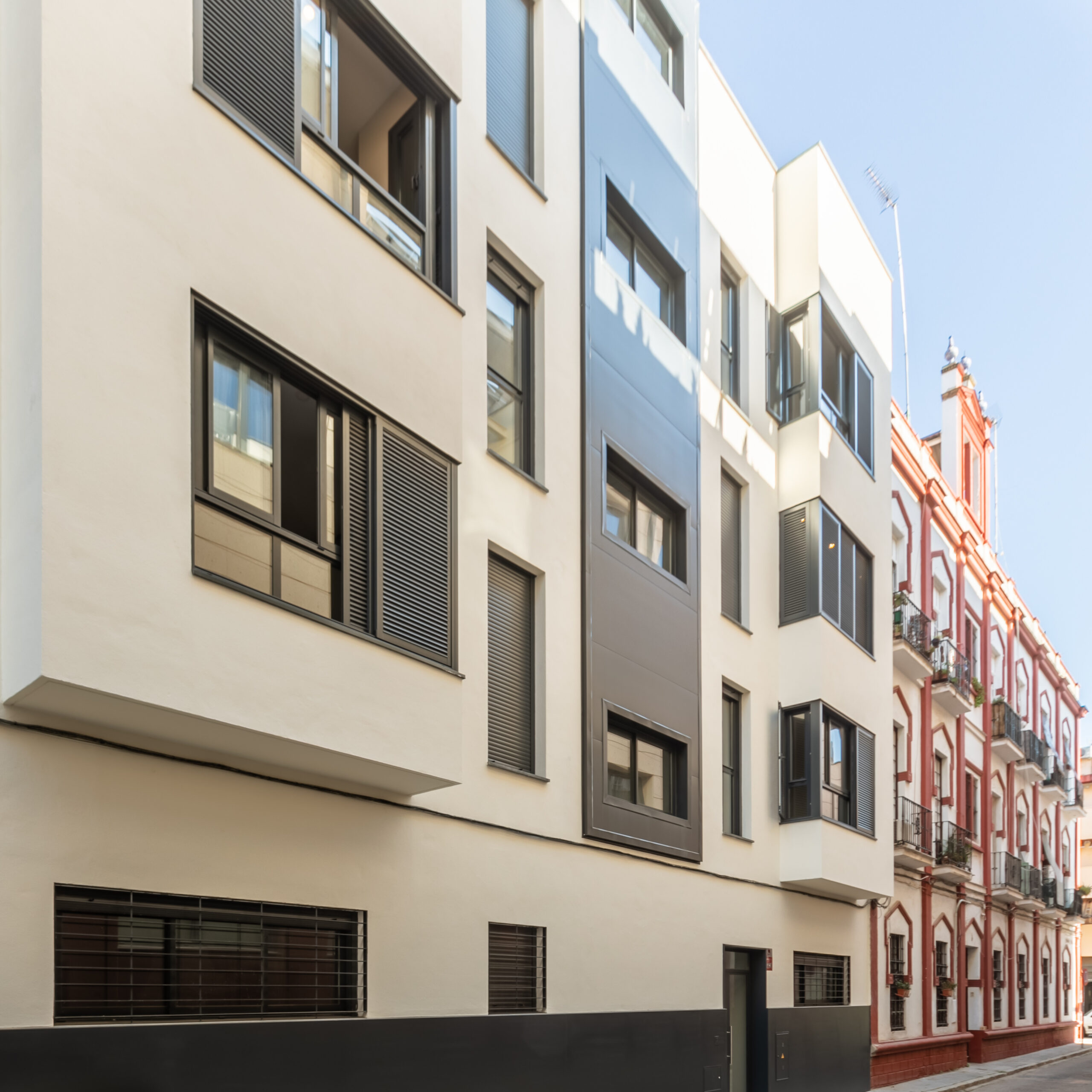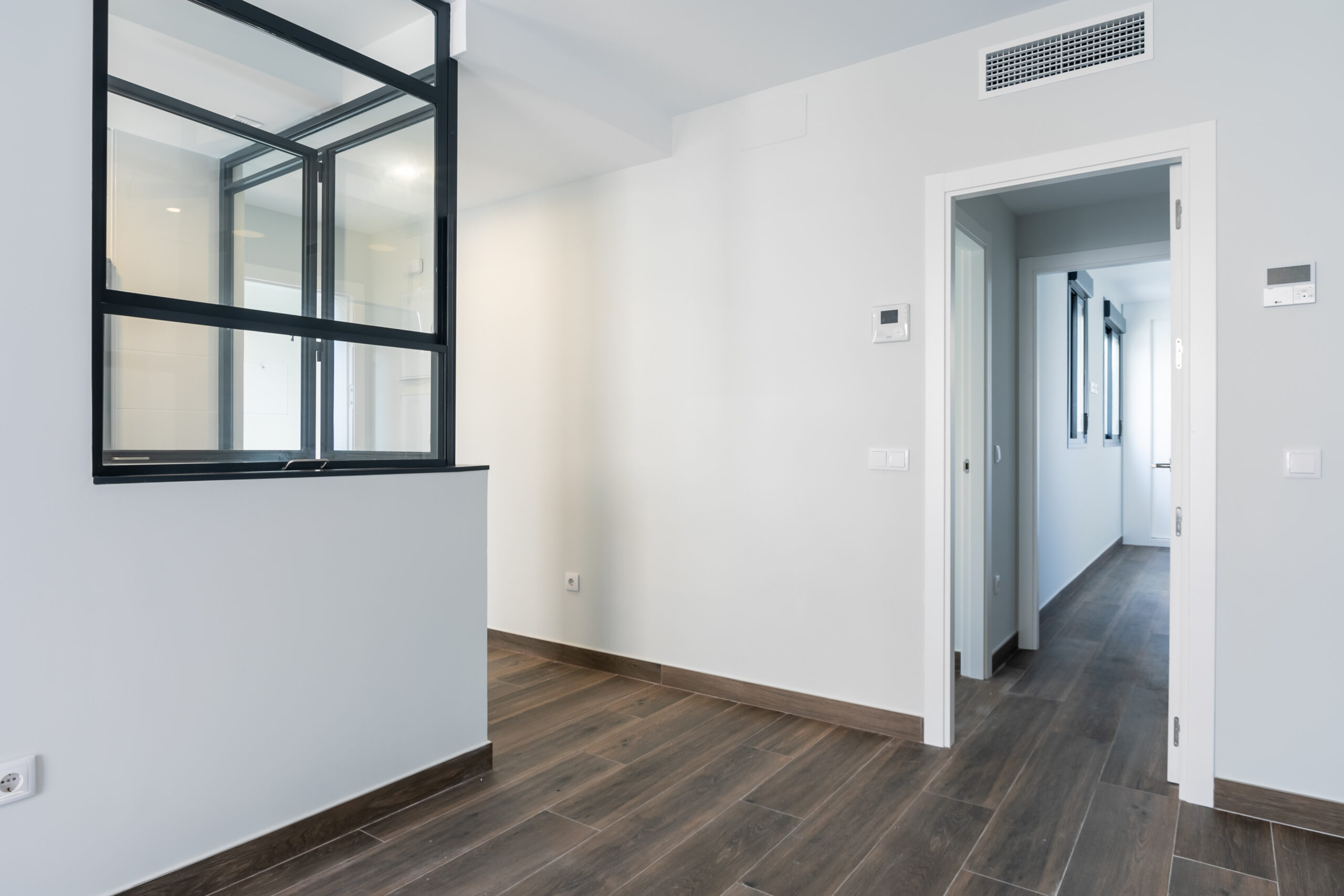 De todas ellas, destacan el salón-cocina, que se conectan visualmente a través de una carpintería de forja a modo de pasa-platos, que posibilita una iluminación natural abundante durante todo el día y a su vez agradable al presentar su fachada a una calle estrecha cuyos edificios arrojan la sombra necesaria para proteger los amplios ventanales de un soleamiento agresivo.«